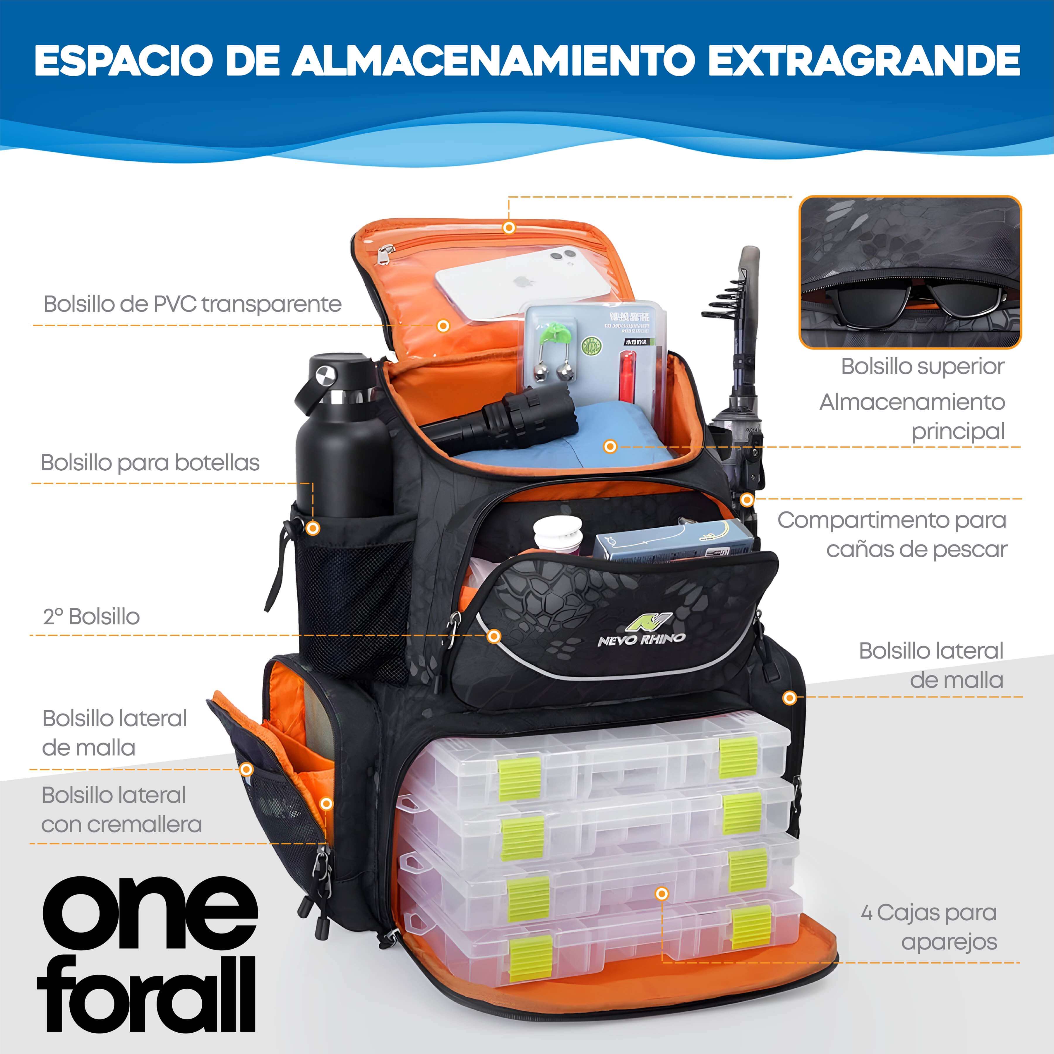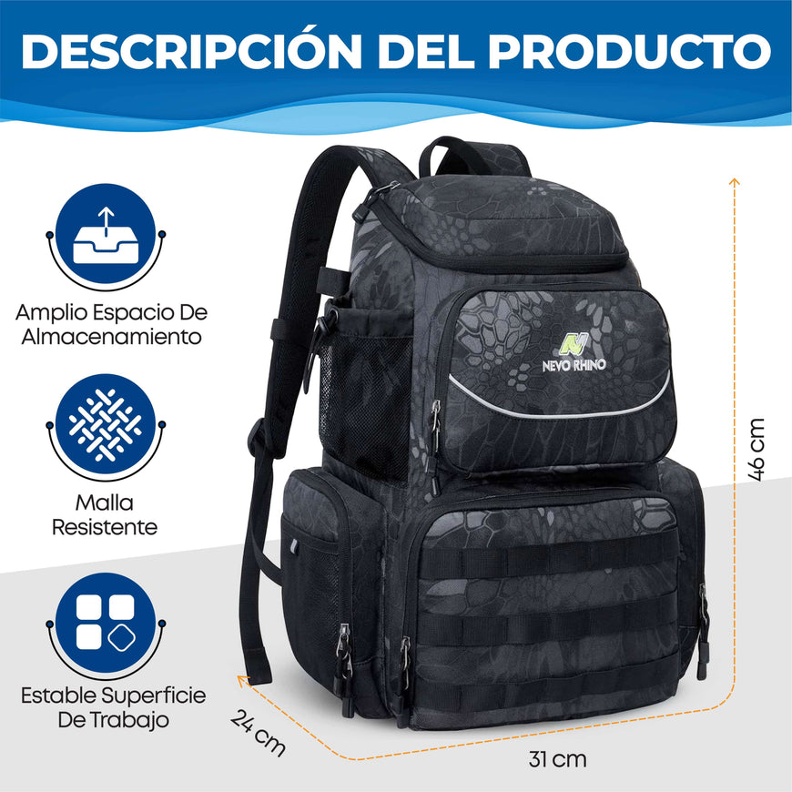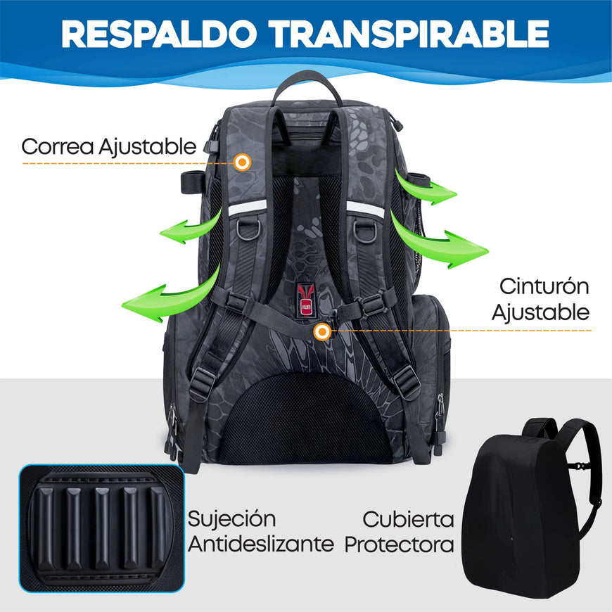 Su diseño ergonómico con correas acolchadas y ajustables distribuye el peso de manera equilibrada para que lleves todo tu kit de pesca sin esfuerzo. Espaciosa y práctica, ofrece capacidad suficiente para cañas telescópicas, carretes, cajas de señuelos, herramientas y hasta ropa de recambio.