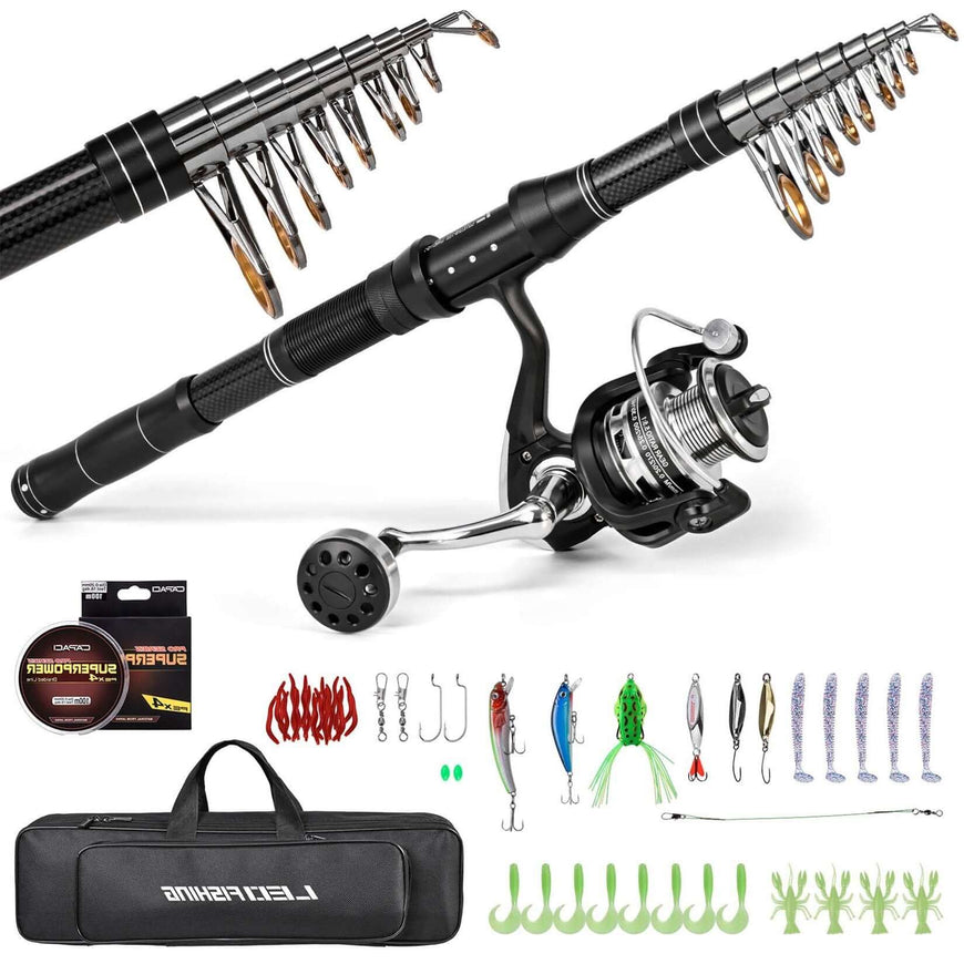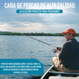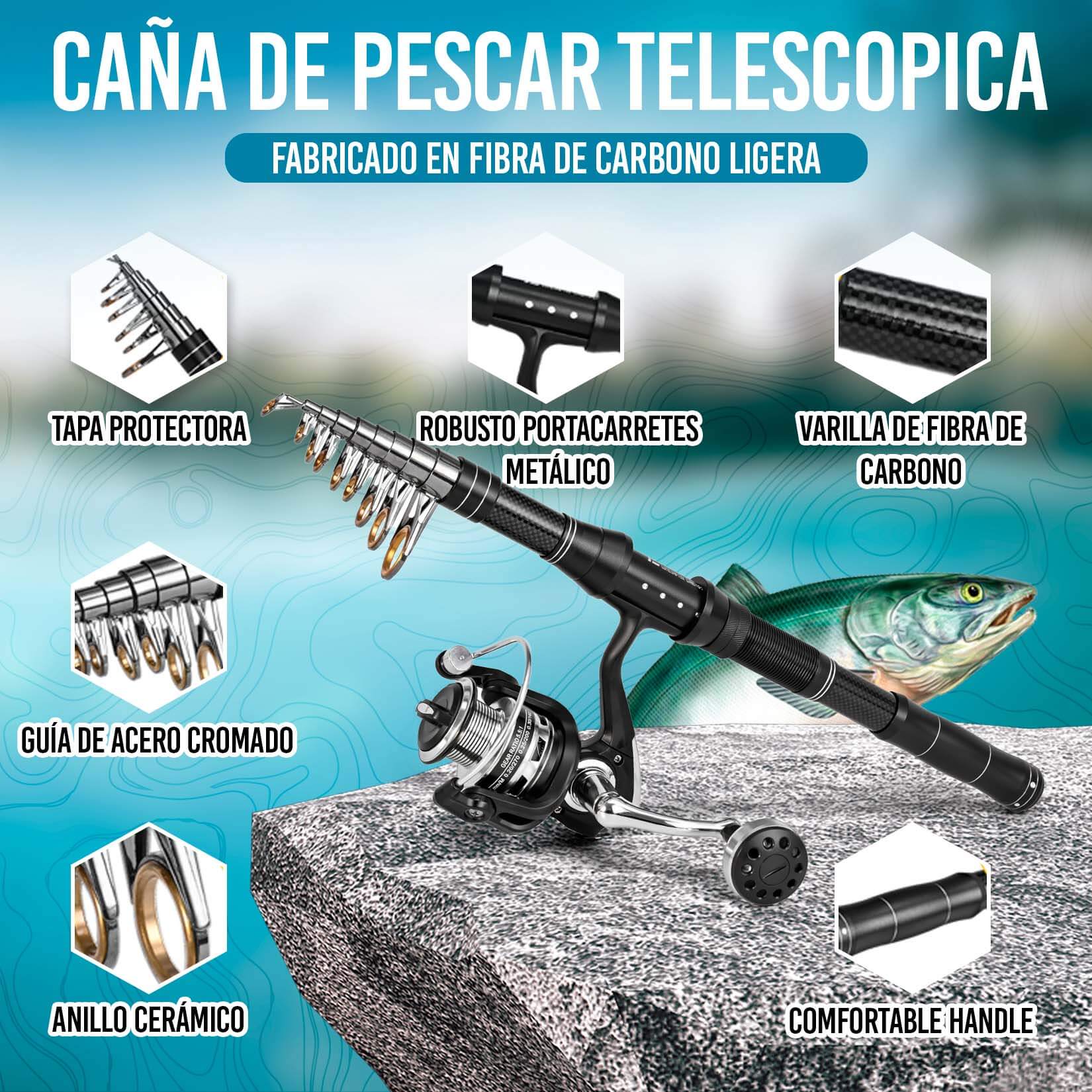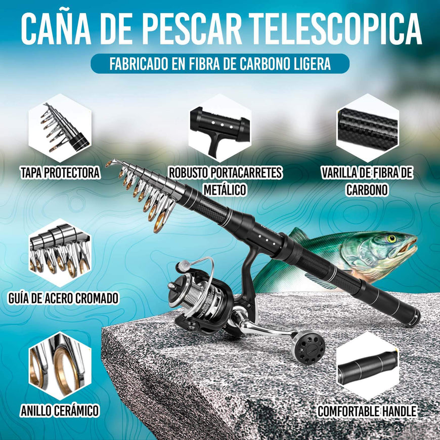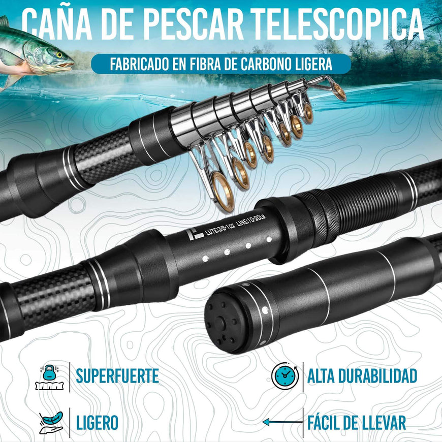 • 🪶 Diseño telescópico y materiales de calidad: La caña de pescar telescópica está fabricada con materiales duraderos como carbono, ofreciendo ligereza sin sacrificar fuerza.