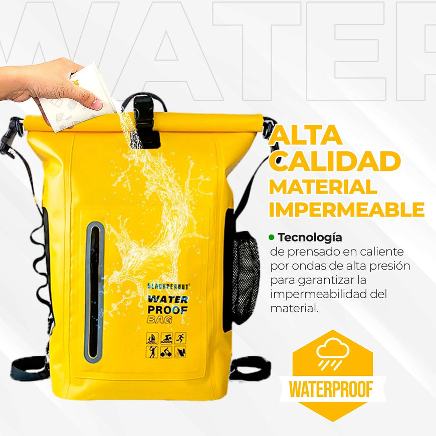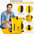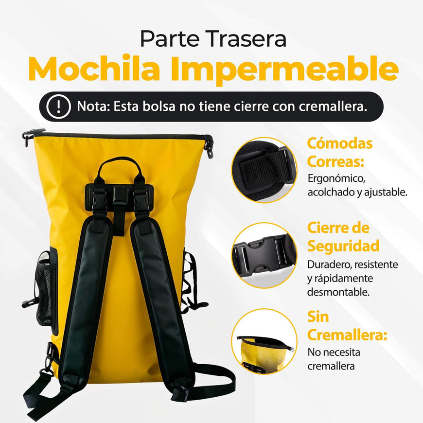 Fabricada con materiales de alta calidad y sellado de costuras, esta mochila estanca asegura una protección total contra el agua, la humedad y la arena. Podrás llevar dentro tu móvil, cartera, llaves o ropa sin miedo a que se mojen. Es la aliada perfecta para deportes acuáticos, travesías en kayak, paddle surf, pesca, senderismo en zonas húmedas o simplemente para proteger tus pertenencias en días lluviosos.