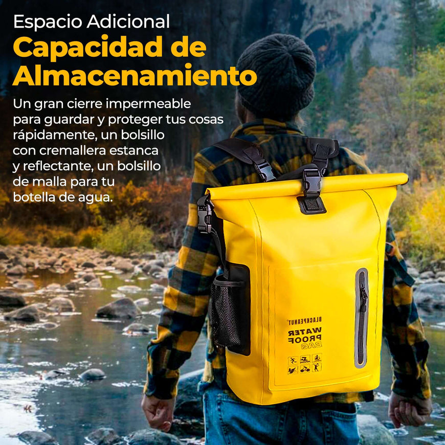Además del compartimento principal estanco, cuenta con un práctico bolsillo externo diseñado especialmente para llevar tu botella de agua siempre a mano. Mantén tu hidratación bajo control durante tus aventuras al aire libre sin necesidad de abrir la mochila constantemente.